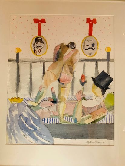 Den första bilden kallade jag UPPVAKTNINGEN den andra FÖRÄLSKELSEN (såld) och den tredje BRÖLLOPSBESTYR. Vid första ögonkastet ser man inte, att kropparna är utrivna från gamla akvareller. På den bilden, som jag bifogar, är allt mycket bråttom – bruden slänger sin slöja – brudgummen hinner inte ta av sig hatten – svärmor, som porträtt, tappar hakan medan svärfar ler i mjugg.